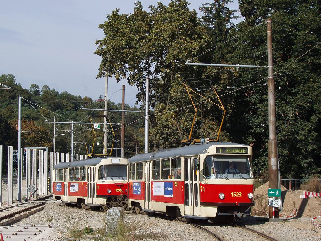 Fotografie ČKD Tatra T3 1523 DPMB | ČKD Tatra T3 1556 DPMB | Brno-Pisárky, Kamenomlýnská | Fotogalerie BMHD