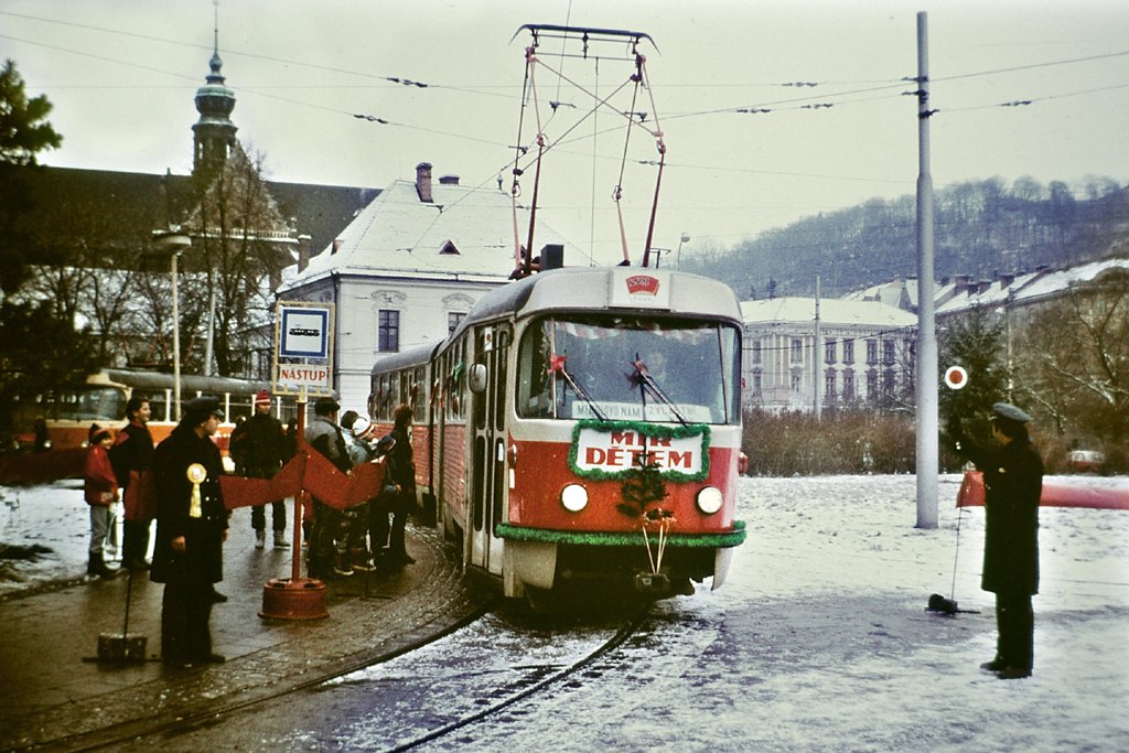Výzdoba tramvaje pro zvláštní jízdu SSM (Socialistický svaz mládeže), zřejmě při příležitosti některého komunistického svátku.