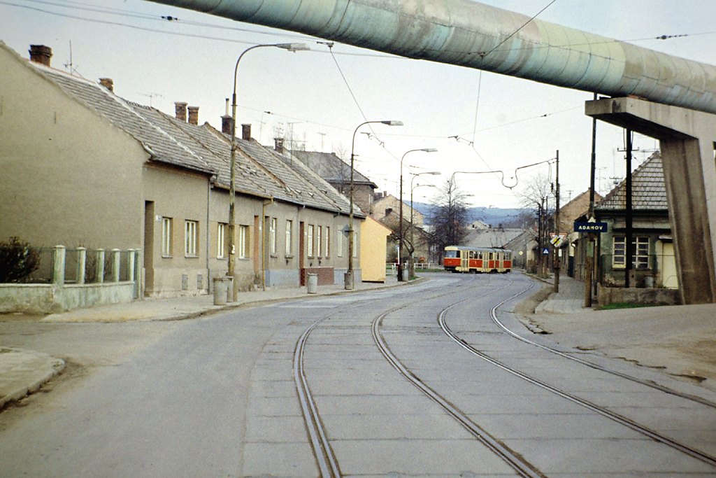 Tramvajová trať v ulici Karlova do smyčky Židenice byla postavena v roce 1948. Tento krátký spojovací úsek (na snímku) pokračující dále od smyčky k obřanské trati však byl postaven až v roce 1968. Provoz na obou úsecích byl ukončen v roce 1985, a zřejmě z téhož roku pochází i fotografie. Tramvaj v pozadí právě odbočuje na obřanské trati z ulice Valchařské do ulice Selská.