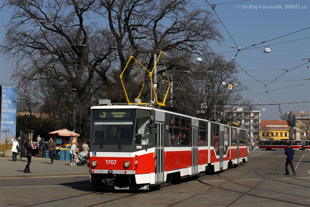KT8D5R.N2 1707 krátce po 2. VP, při které byla provedena pouze příprava pro dosazení klimatizací Waeco CA-RT 880. V rámci dopravních opatření při výluce ulice Milady Horákové probíhající od 15. 3. 2014 byla zavedena linka x3 v trase Rakovecká – (Vozovna Komín) – Česká – Cejl zakončená úvratí v zastávce Dětská nemocnice.