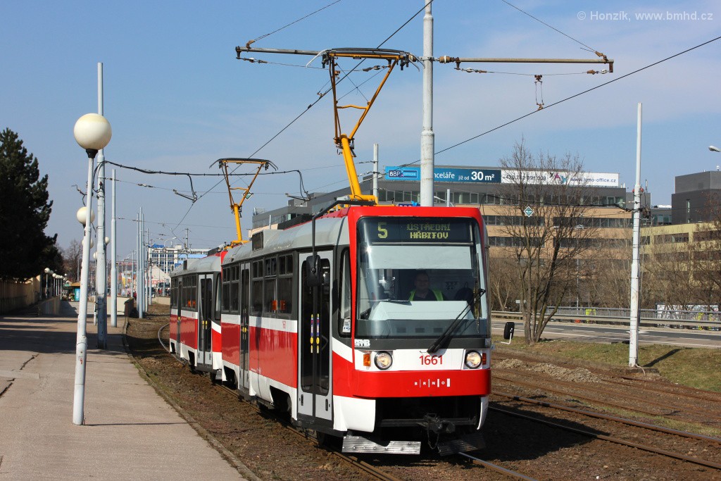 Souprava T3R 1661+1662 krátce po provedené velké prohlídce. Kvůli dlouhodobé výluce v ulici Milady Horákové (od 15.3.2014 do 26.6.2015) spojené s celkovou rekonstrukcí ulice byla linka 5 v úseku Jugoslávská - Česká odkloněna ulicemi Cejl a Rooseveltovou. V nepracovních dnech na ni byly nasazovány hlavně sólo vozy. Naopak v pracovních dnech kvůli 10minutovému intervalu na ní jezdily soupravy tramvají T3 a Škody 13T.