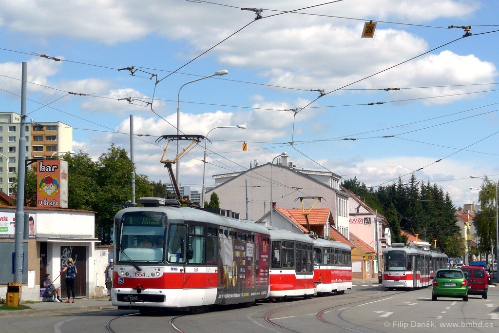 Po dobu opravy kolejí na Mendlově náměstí byla linka 1 v úseku Hlavní nádraží - Vozovna Komín vedena odklonem ulicemi Husova - Veveří - Minská.
