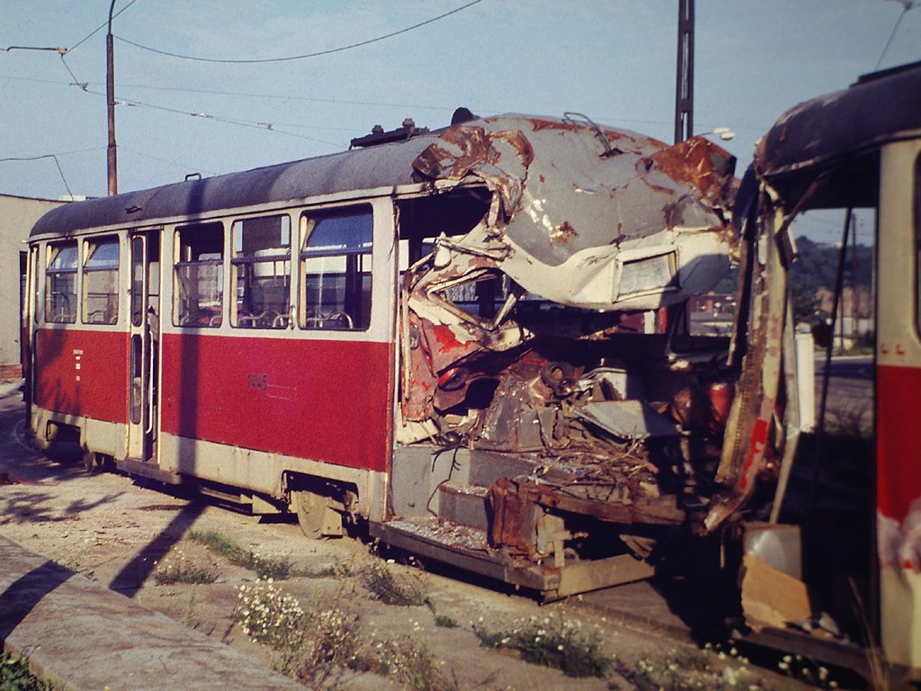 Následky nehody s vozem 1585 na Kamenomlýnské v roce 1986.