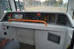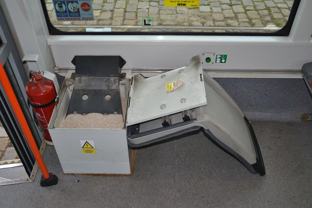 Pravý přední pískovač vozu VarioLF2 1100. Jedná se o starší provedení pohonu - mechanická záklopka ovládaná elektromagnetem. Pod víkem je patrný černý kryt, který je určen proti prášení do vozu při plnění pískovačů zvenku pomocí plnící pistole (tento systém v Brně není).