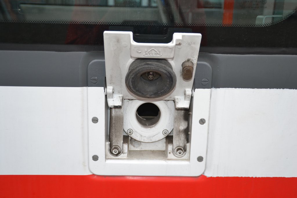 Otvor na bočnici vozu pro možnost plnění pískovaču zvenčí pomocí tlakové plnící pistole (v Brně tento systém není)
