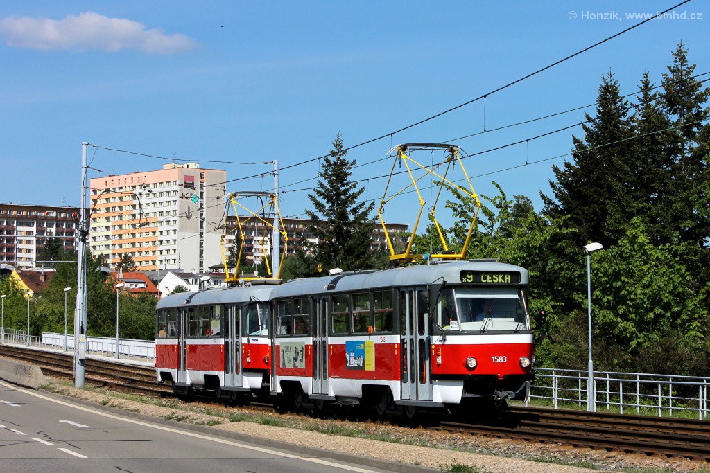 1583 asi měsíc a půl po provedené velké prohlídce. Její "B" T3P 1576 měla velkou prohlídku dokončenou až počátkem května 2015 z důvodu její opravy po poruše. Kvůli dlouhodobé výluce v ulici Milady Horákové (od 15.3.2014 do 26.6.2015) spojené s celkovou rekonstrukcí ulice byla zavedena polookružní výluková linka x9 v trase Lesná - Malinovského náměstí - Hlavní nádraží - Náměstí Svobody - Česká - Malinovského náměstí - Lesná.