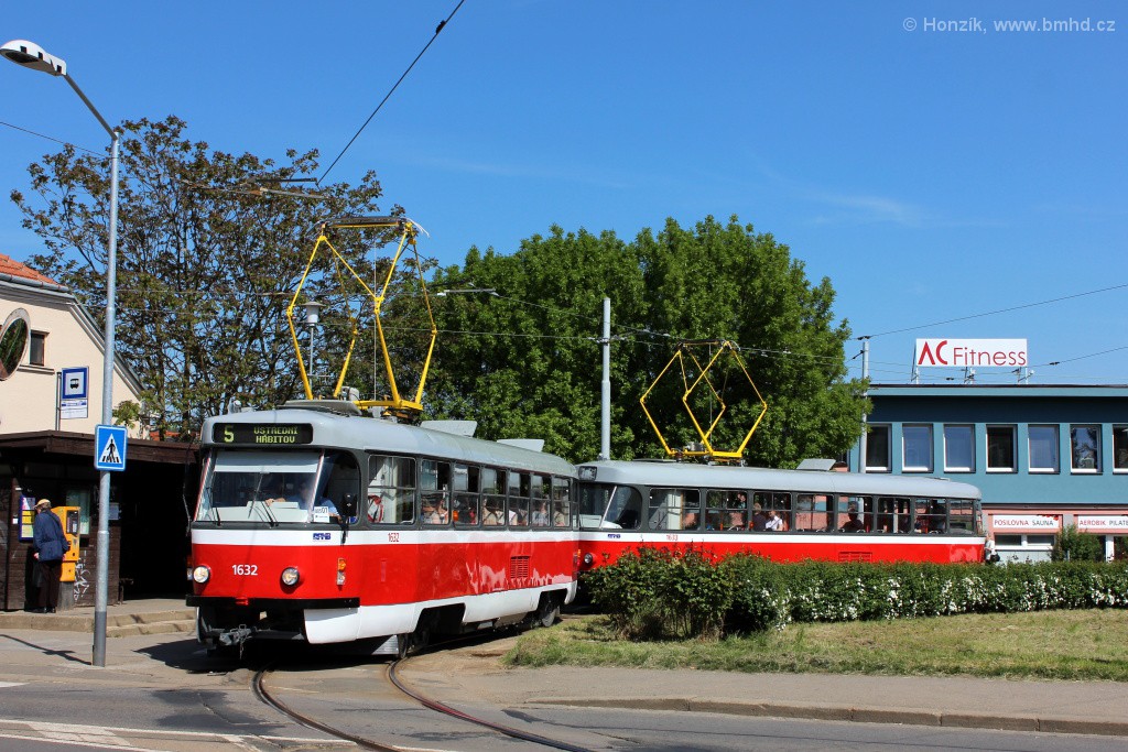 Souprava T3P 1632+1633 krátce po provedené velké prohlídce. Kvůli dlouhodobé výluce v ulici Milady Horákové (od 15.3.2014 do 26.6.2015) spojené s celkovou rekonstrukcí ulice byla linka 5 v úseku Jugoslávská - Česká odkloněna ulicemi Cejl a Rooseveltovou. V nepracovních dnech na ni byly nasazovány hlavně sólo vozy. Naopak v pracovních dnech kvůli 10minutovému intervalu na ní jezdily soupravy tramvají T3 a Škody 13T.