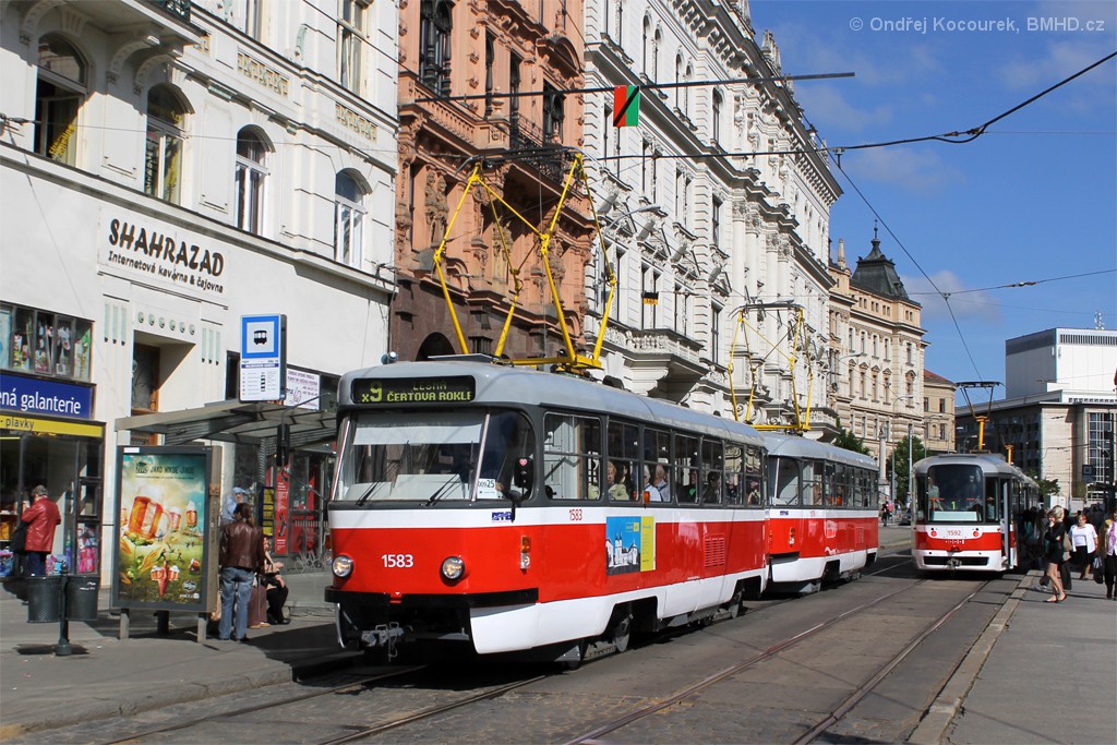 Jedno z prvních vypravení T3P 1576 po 2. VP. V souvislosti s dlouhodobou výlukou ulice Milady Horákové probíhající od 15. 3. 2014 byla zavedena výluková linka x9 v trase Lesná – Česká s jednosměrným obratem přes Náměstí Svobody a ulici Rooseveltovu.