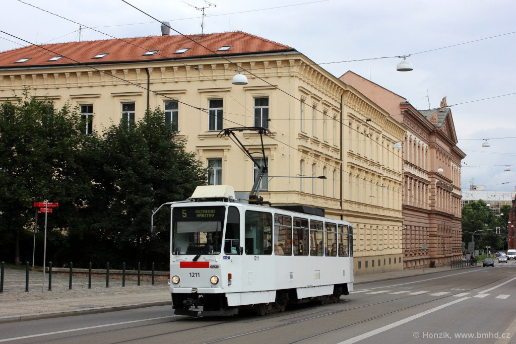 T6A5 1211 mimořádně vypravená jako sólo z důvodu poruchy jejího B-vozu 1212. Kvůli dlouhodobé výluce v ulici Milady Horákové spojené s celkovou rekonstrukcí ulice byla linka 5 v úseku Jugoslávská - Česká odkloněna ulicemi Cejl a Rooseveltovou. V nepracovních dnech na ni bývaly nasazovány hlavně sólo vozy, naopak v pracovních dnech kvůli 10minutovému intervalu na ní jezdí soupravy tramvají T3 a Škody 13T.