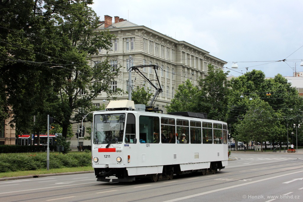 T6A5 1211 mimořádně vypravená jako sólo z důvodu poruchy jejího B-vozu 1212. Kvůli dlouhodobé výluce v ulici Milady Horákové spojené s celkovou rekonstrukcí ulice byla linka 5 v úseku Jugoslávská - Česká odkloněna ulicemi Cejl a Rooseveltovou. V nepracovních dnech na ni bývaly nasazovány hlavně sólo vozy, naopak v pracovních dnech kvůli 10minutovému intervalu na ní jezdí soupravy tramvají T3 a Škody 13T.