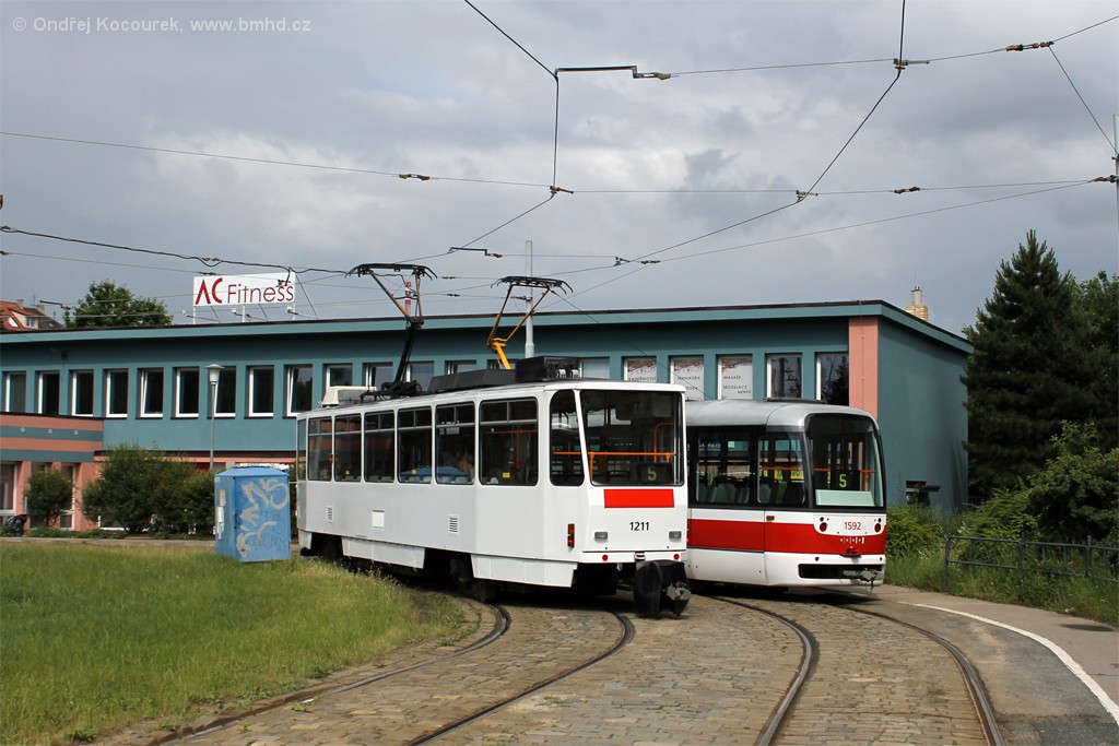 T6A5 1211 mimořádně vypravená jako sólo z důvodu poruchy jejího B-vozu 1212. Za zmínku stojí redukce na zadní spřáhlo, bez níž by nebylo možné sólo T6 vypravit na linku. Kvůli dlouhodobé výluce v ulici Milady Horákové spojené s celkovou rekonstrukcí ulice byla linka 5 v úseku Jugoslávská - Česká odkloněna ulicemi Cejl a Rooseveltovou. V nepracovních dnech na ni bývaly nasazovány hlavně sólo vozy, naopak v pracovních dnech kvůli 10minutovému intervalu na ní jezdí soupravy tramvají T3 a Škody 13T.