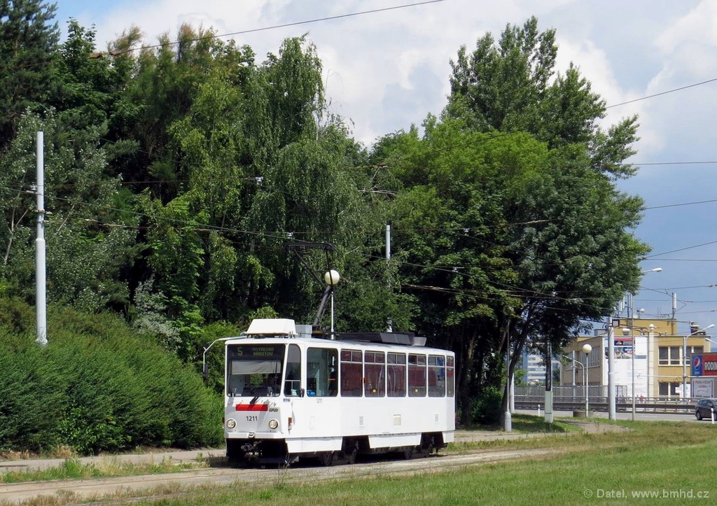 T6A5 1211 mimořádně vypravená jako sólo z důvodu poruchy jejího B-vozu 1212. Kvůli dlouhodobé výluce v ulici Milady Horákové spojené s celkovou rekonstrukcí ulice byla linka 5 v úseku Jugoslávská - Česká odkloněna ulicemi Cejl a Rooseveltovou. V nepracovních dnech na ni bývaly nasazovány hlavně sólo vozy, naopak v pracovních dnech kvůli 10minutovému intervalu na ní jezdí soupravy tramvají T3 a Škody 13T.