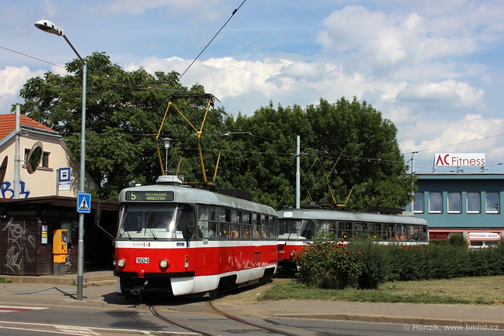 T3G 1604 krátce po stržení reklamy. Kvůli dlouhodobé výluce v ulici Milady Horákové (od 15.3.2014 do 26.6.2015) spojené s celkovou rekonstrukcí ulice byla linka 5 v úseku Jugoslávská - Česká odkloněna ulicemi Cejl a Rooseveltovou. V nepracovních dnech na ni byly nasazovány hlavně sólo vozy. Naopak v pracovních dnech kvůli 10minutovému intervalu na ní jezdily soupravy tramvají T3 a Škody 13T.