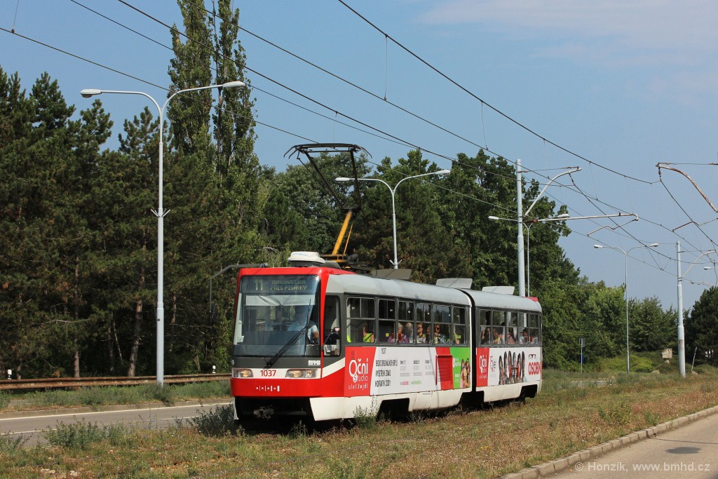 K2R03 1037 s novým bokolepem. Z důvodu dlouhodobé výluky v ulicích Minská a Horova (od 27.6.2015) spojené s celkovou rekonstrukcí těchto ulic byla linka 11 v úseku Česká - Vozovna Komín odkloněna ulicí Husovou, přes Mendlovo náměstí a Pisárky. V nepracovních dnech jezdila pouze v úseku Rakovecká – Malinovského náměstí.