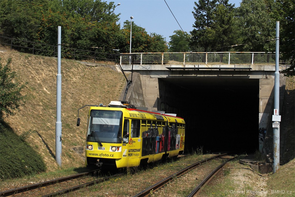 V rámci letních výluk roku 2015 byla realizována rekonstrukce TT v úseku Celní – Bohunická. Linka 2 byla odkloněna do smyčky Švermova a linka 5 byla zkrácena na Mendlovo náměstí. Dva dny po vyfocení této fotografie měl vůz 1003 zahoření na Hlavním nádraží a byl definitivně odstaven.
