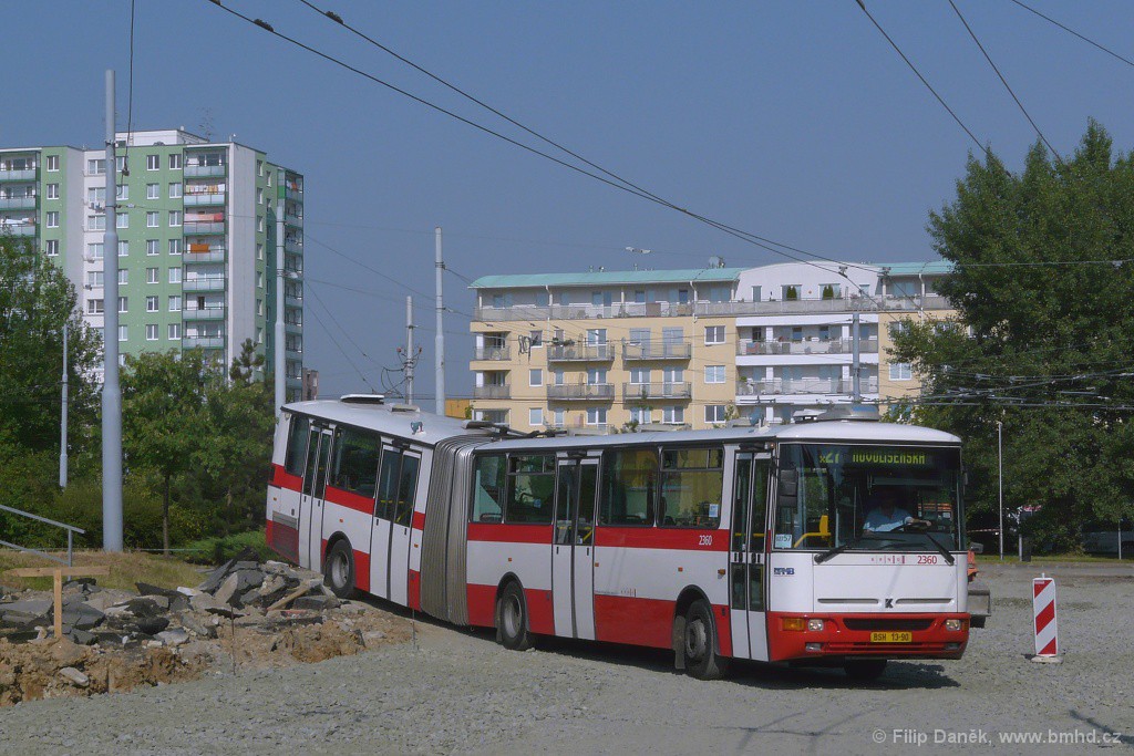 Po dobu třetí etapy rekonstrukce Pálavského náměstí byla zavedena linka x27 v trase Stará Osada - Pálavské náměstí - Novolíšeňská. 2360 na snímku právě projíždí staveništěm na Pálavském náměstí.