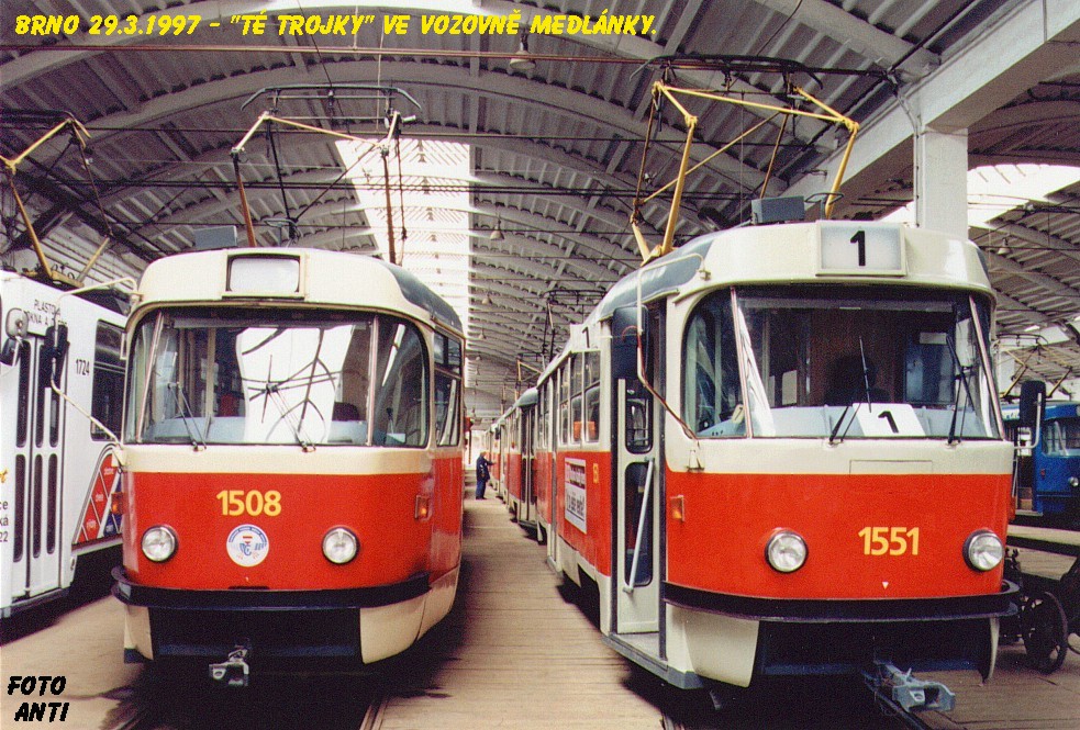 Fotografie ČKD Tatra T3 1508 DPMB | ČKD Tatra T3 1551 DPMB | Brno-Medlánky, Vozovna Medlánky | Fotogalerie BMHD