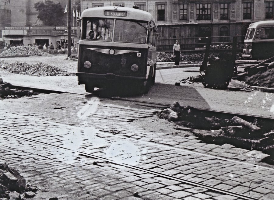 Trolejbus ev. č. 23 projíždí setrvačností přes provizorní přejezd během výstavby nového tramvajového kolejiště před hlavním nádražím.