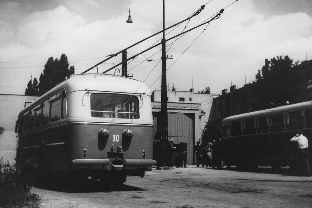 Nádvoří vozovny Husovice v 60. letech, kdy byla pro trolejbusy využívána jen její pravá část.