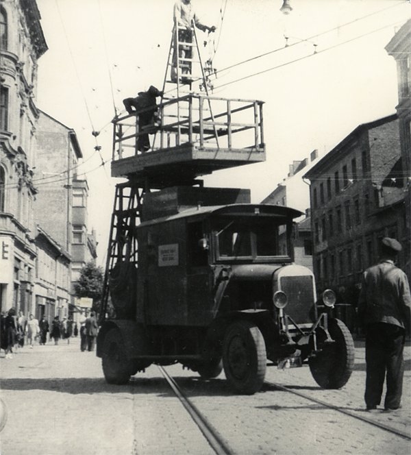 Montáž trolejového vedení pro první trolejbusovou trať v Brně. Zleva se napojuje jednostopá manipulační trať z ulice Špitálka, oba směry v ulici Křenová jsou propojeny trolejovou spojkou.
