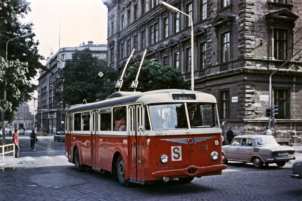 Do roku 1971 byla konečná trolejbusů v Brandlově ulici projížděna v opačném směru než dnes, trolejbus na snímku přejíždí z Moravského náměstí přímo na Kounicovu.