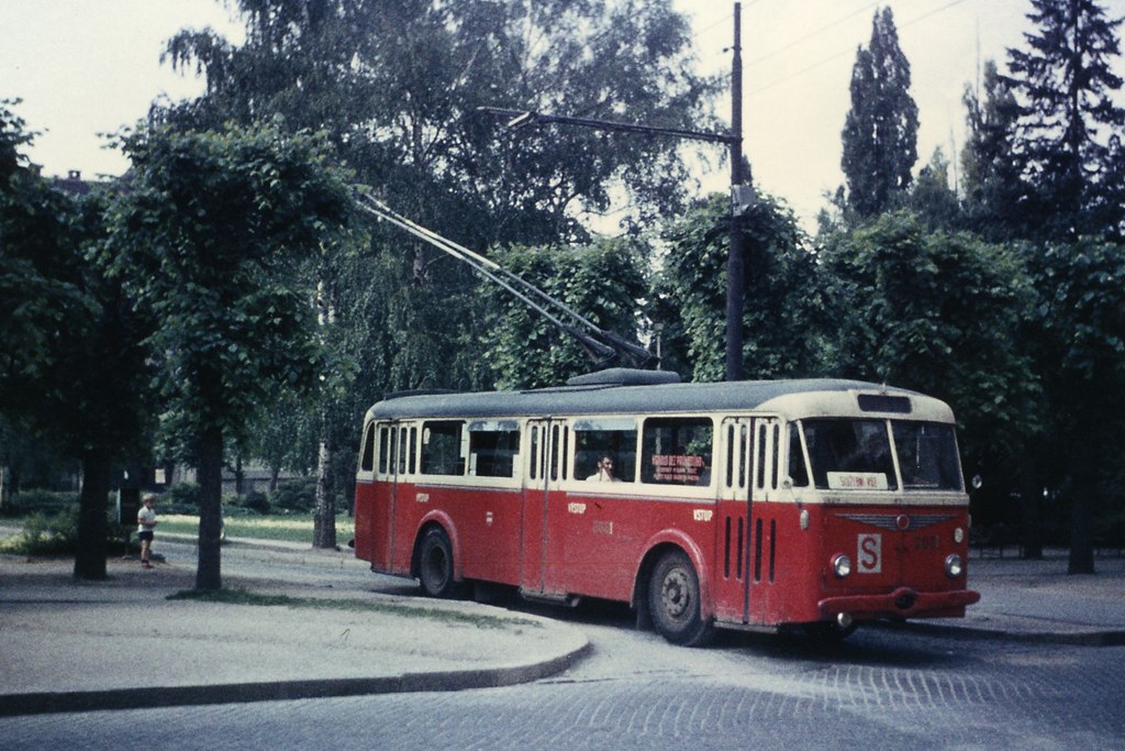 Od roku 1961 projížděly trolejbusy jednostopým úsekem přes Slovanské náměstí. Na sloupu je patrná světelná signalizace.