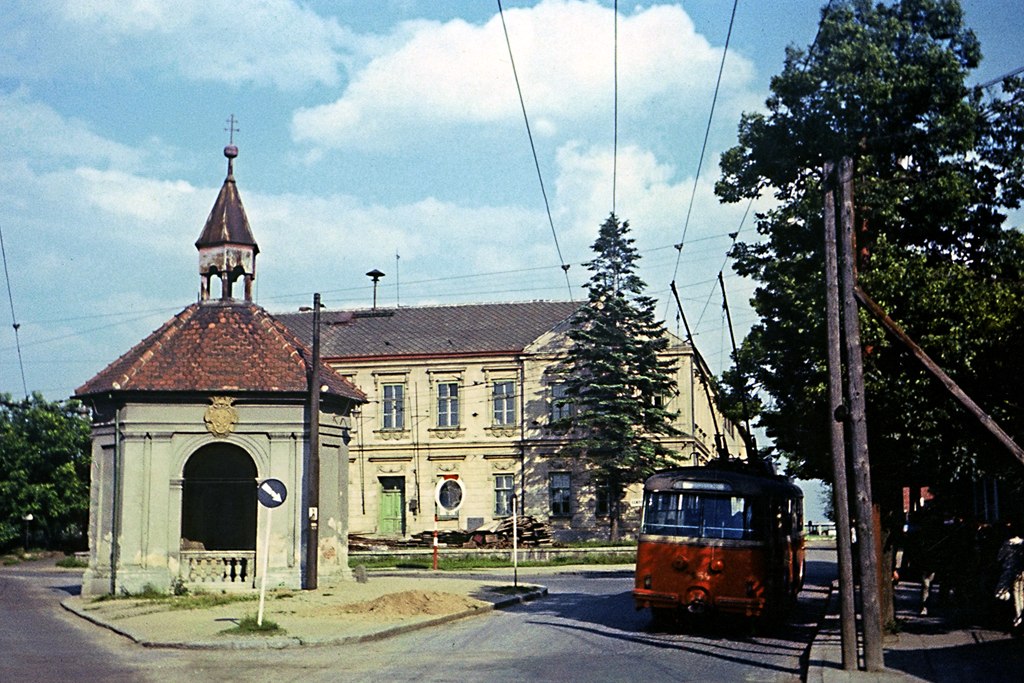 Situace u slatinské kapličky po prodloužení tratě do Šlapanic (v letech 1954 - 1974): levá stopa tvoří manipulační smyčku kolem kapličky, na pravé stopě stojí trolejbus na zastávce směr Šlapanice.