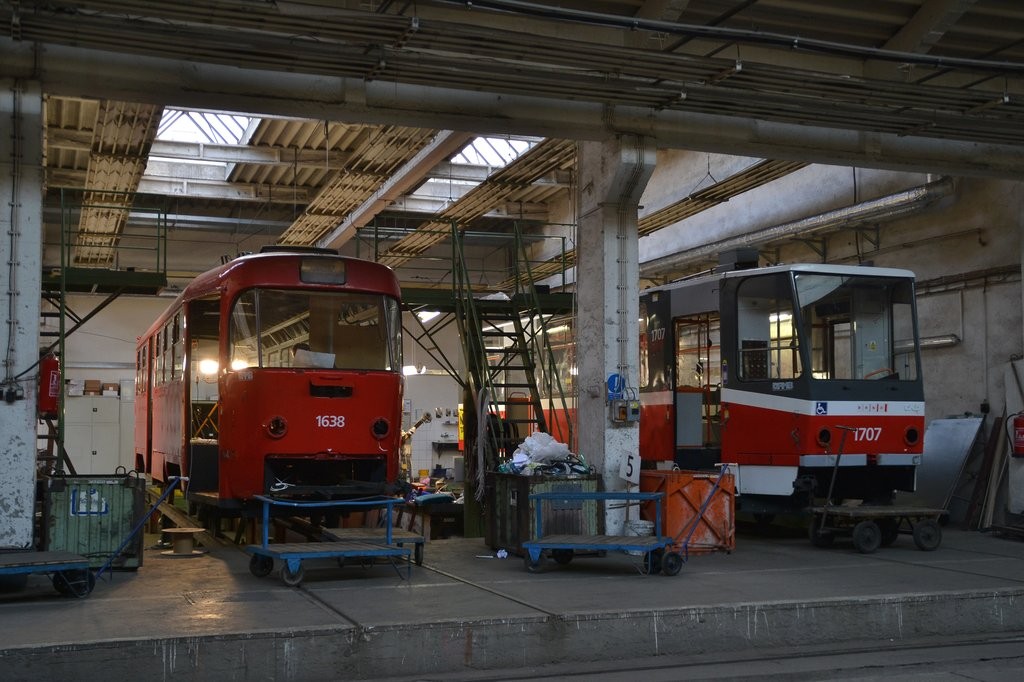 Fotografie ČKD Tatra T3G 1638 DPMB | ČKD Tatra KT8D5R.N2 1707 DPMB | Brno, Ústřední dílny | Fotogalerie BMHD