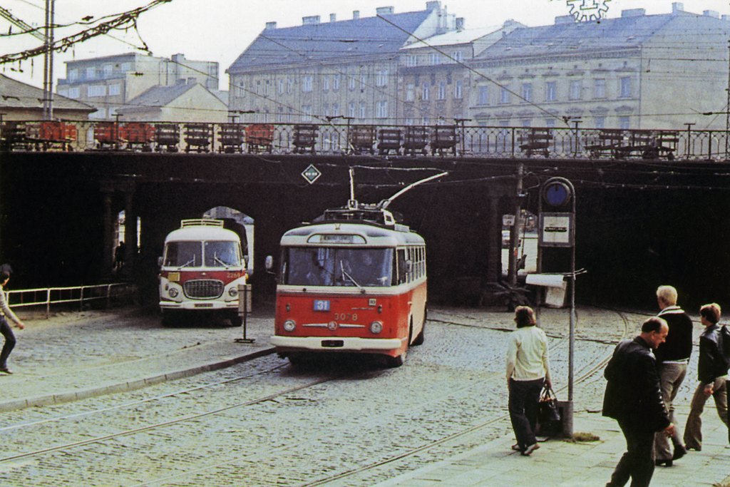 Situace u hlavního nádraží v letech 1966-1981: trolejbusy podjížděly viadukt společně s tramvajemi, trolejbusová stopa byla samostatná s vyjímkou krátkého úseku podél tramvajového ostrůvku, kde byl využit jeden tramvajový vodič.