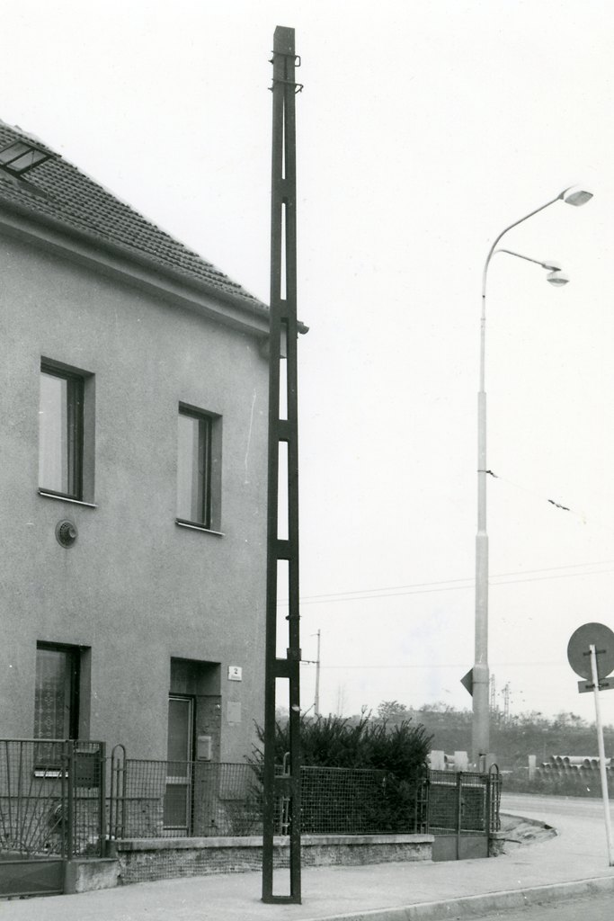 Příhradový sloup jako pozůstatek pomocné stopy, která zde byla postavena pro otáčení trolejbusů linky 21 při každoročních manifestacích 1. máje, kdy dále do centra města nebylo možno projet.