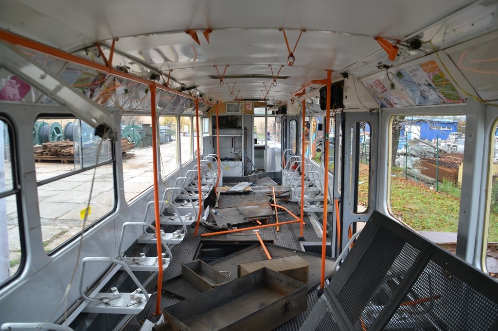 interiér T3M 1541 připravené k sešrotování na šrotovací koleji ve vozovně Medlánky