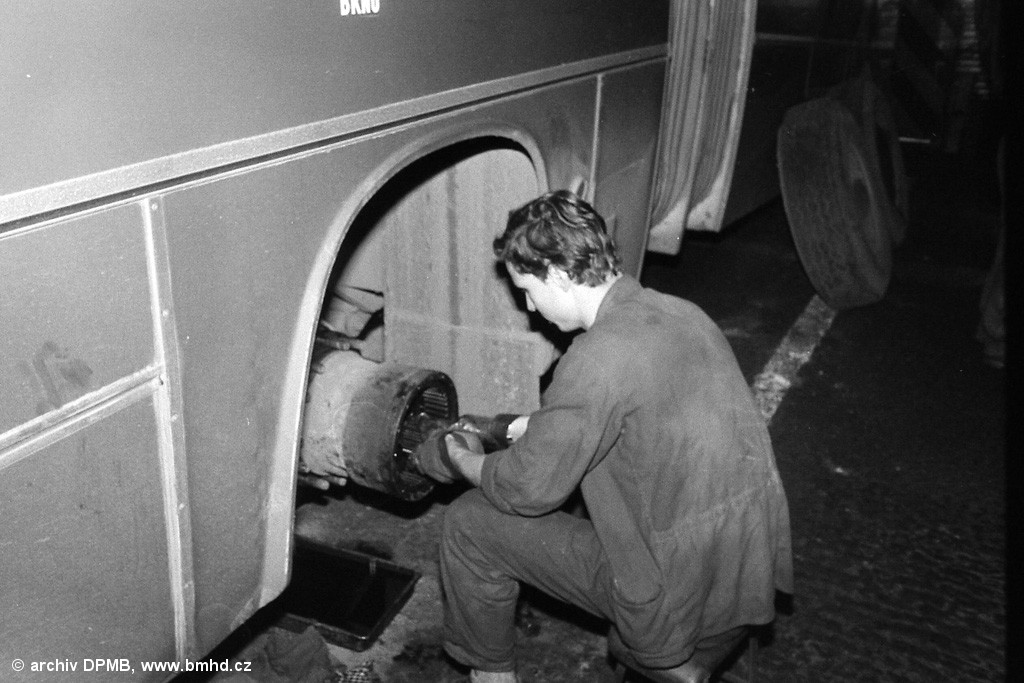 Mechanik střediska AD Medlánky opravuje hnací nápravu Ikarusu 280