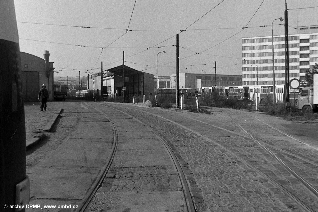 Pohled na objízdnou kolej a odstavnou plochu autobusů ve vozovně Medlánky. Ve střední části snímků je dobře viditelná původní mycí linka tramvají.