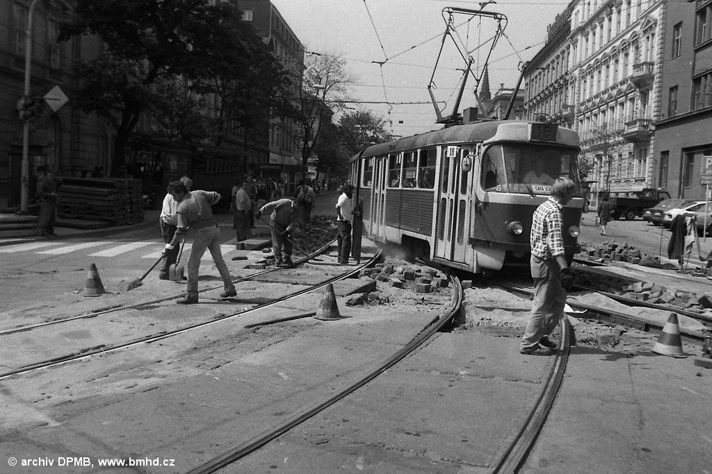 Oprava tramvajové trati na Joštově. Škoda, že v místě evidenčního čísla stojí jeden z dělníků a není tedy možné přesně identifikovat vůz.