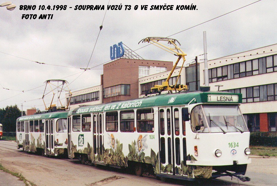Souprava tramvají T3, které byly v roce 1992 jako vůbec první modernizovány na T3G. Při této opravě vůz 1634 obdržel také převíjecí transparent BROSE a polopantograf Schunk.