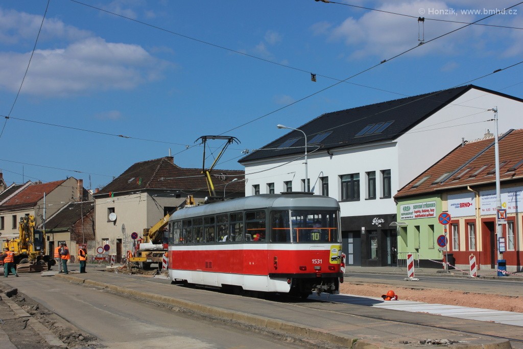 Z důvodu rekonstrukce tramvajové trati a povrchu v ulici Olomoucké (1.4. – 30.6.2016) byl zaveden jednokolejný provoz. Nejdříve byla měněna kolej ve směru do centra a od 15.5.2016 probíhala výměna kolejí ve směru z centra.