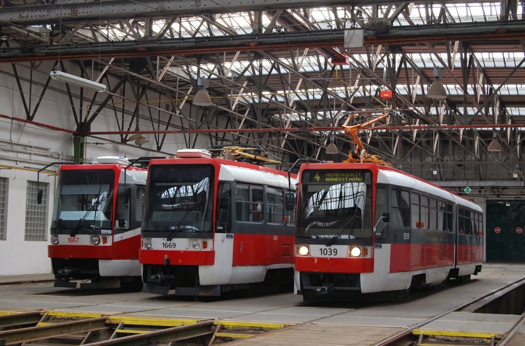 Fotografie ČKD Tatra K2R 1039 DPMB | ČKD DS T3RF 1669 DPMB | ČKD DS T3R 1667 DPMB | Brno-Pisárky, vozovna Pisárky | Fotogalerie BMHD
