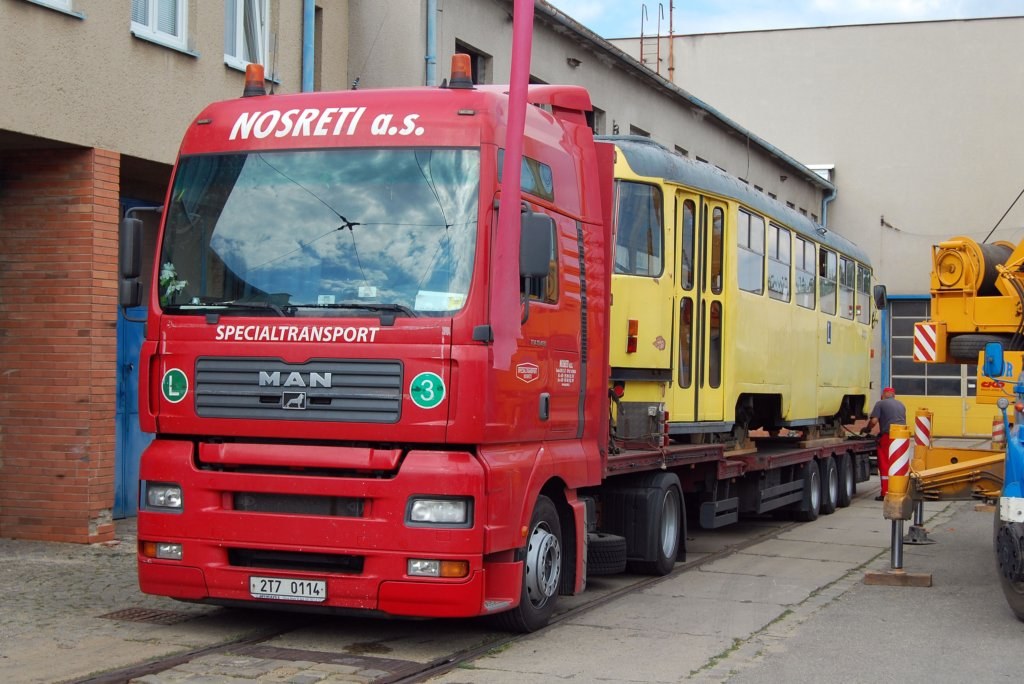 nakládání cvičné tramvaje na trailer při přepravě do TMB