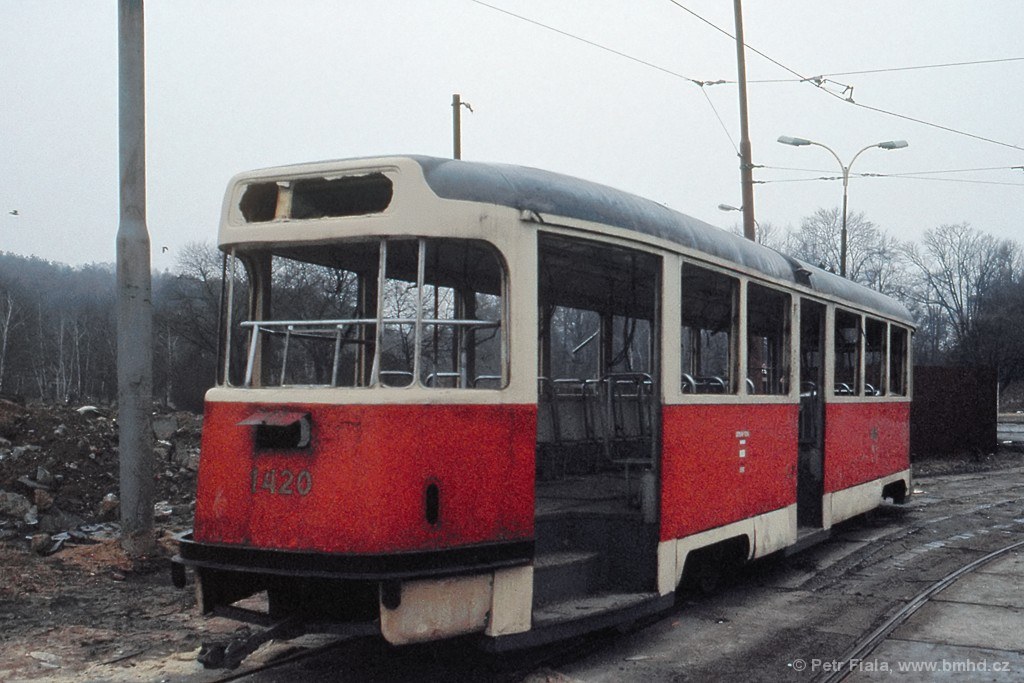T2R 1420 přichystaná k fyzické likvidaci ve vozovně Medlánky (tehdy Královo Pole).