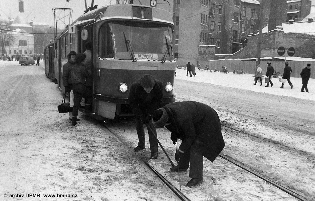 Při sněhových kalamitách bez vyhřívaných hrotnic se jezdilo těžko. Fotografie zachycuje úsilí pracovníků snažících se přestavět výhybku plnou zajezděného sněhu při sněhové kalamitě v lednu 1987.