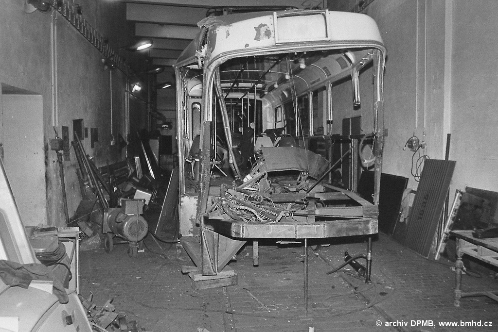 Poškozený vůz K2 po nehodě v karosárně vozovny Pisárky.