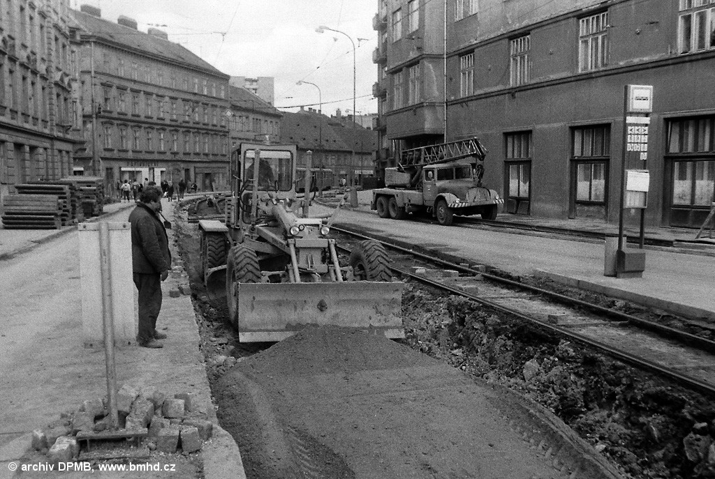 Rekonstrukce tramvajové trati v Křížové ulici v dubnu 1988.