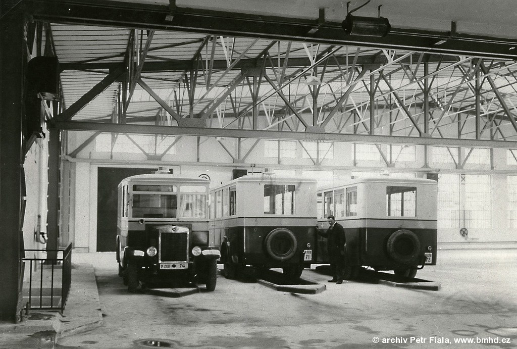 Autobusy Škoda 505 NR (případně i Fram E18) v garážích Grmelova.