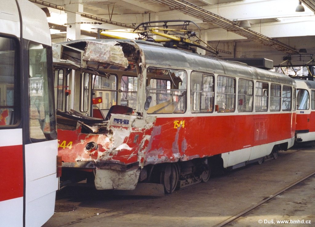 T3M 1544 po nehodě s autobusem v Obřanech na křižovatce Obřanská x Fryčajova. Řidič tramvaje utrpěl smrtelná zranění.