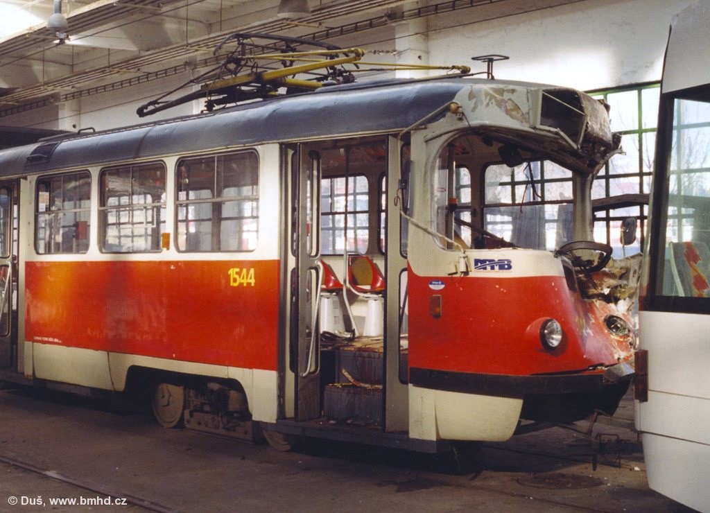 T3M 1544 po nehodě s autobusem v Obřanech na křižovatce Obřanská x Fryčajova. Řidič tramvaje utrpěl smrtelná zranění.