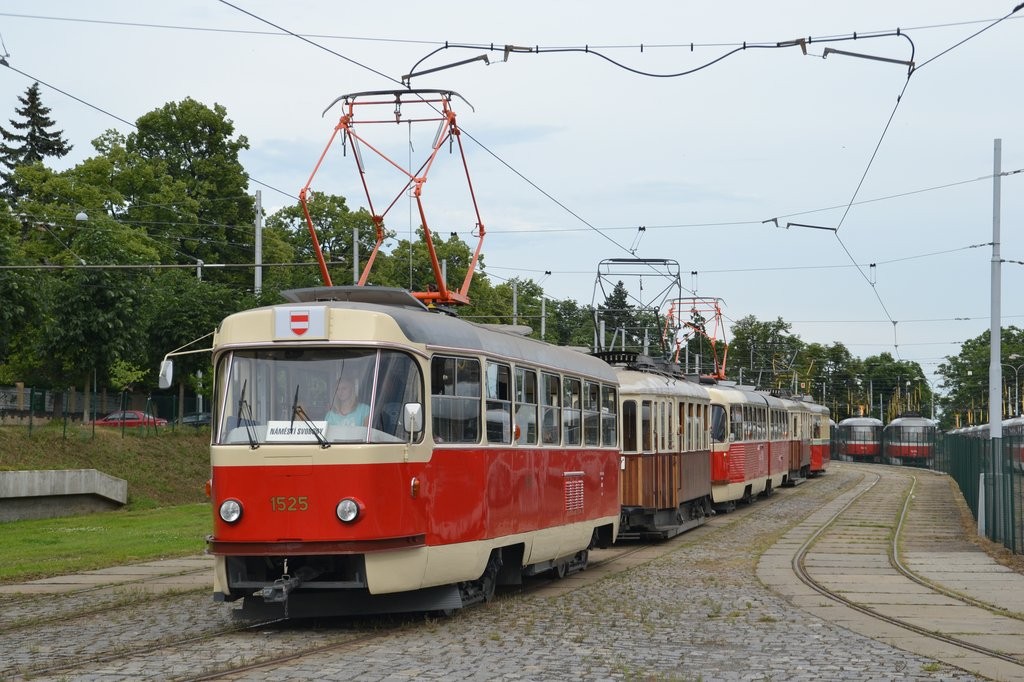 Dopravní nostalgie 2016 - konvoj historických tramvají čekající na příjezd konvoje historických trolejbusů.