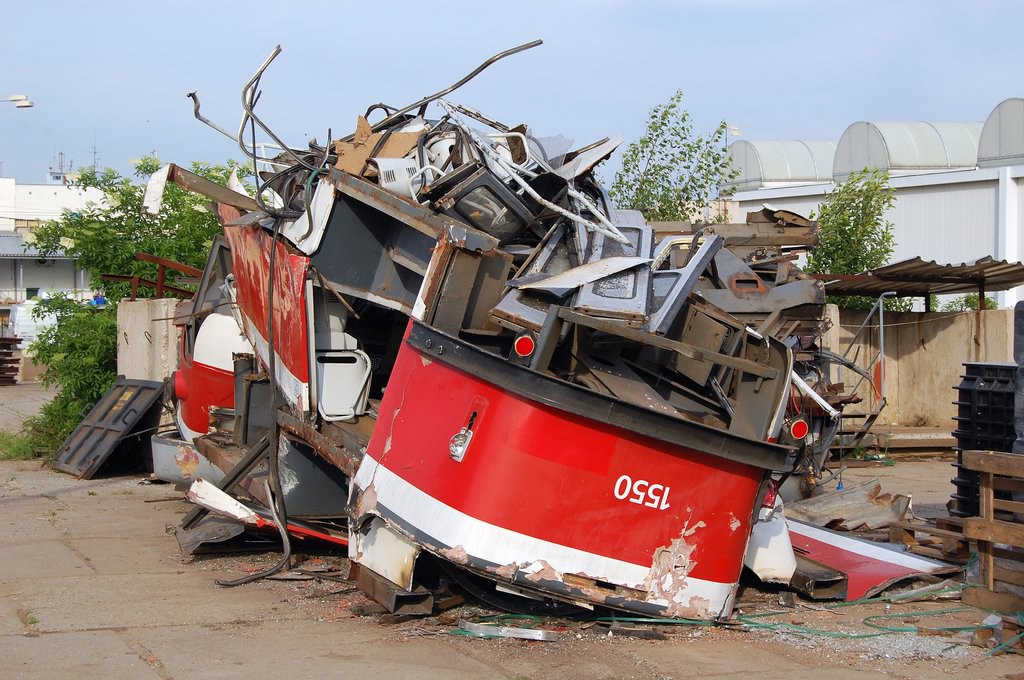 Rozřezané torzo vozu T3 1550 čeká na odvoz na šrotiště.