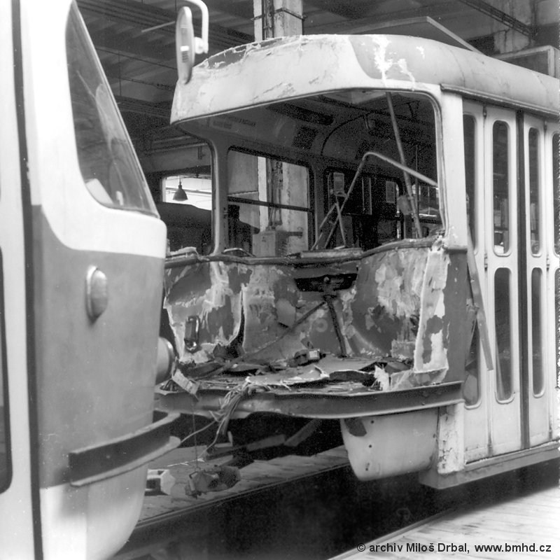 následky najetí 1571+1600 do 1525+1512 v zastávce Jungmannova dne 2.6.1984