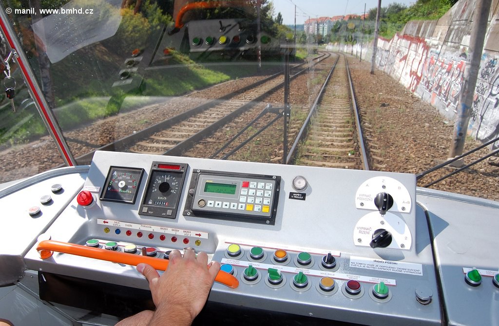 pohled přes palubní desku tramvaje T3M zapojené do obousměrné soupravy "PX" na líšeňskou trať v úseku Kotlanova - Masarova, kde lze běžně potkat pouze tramvaje KT8