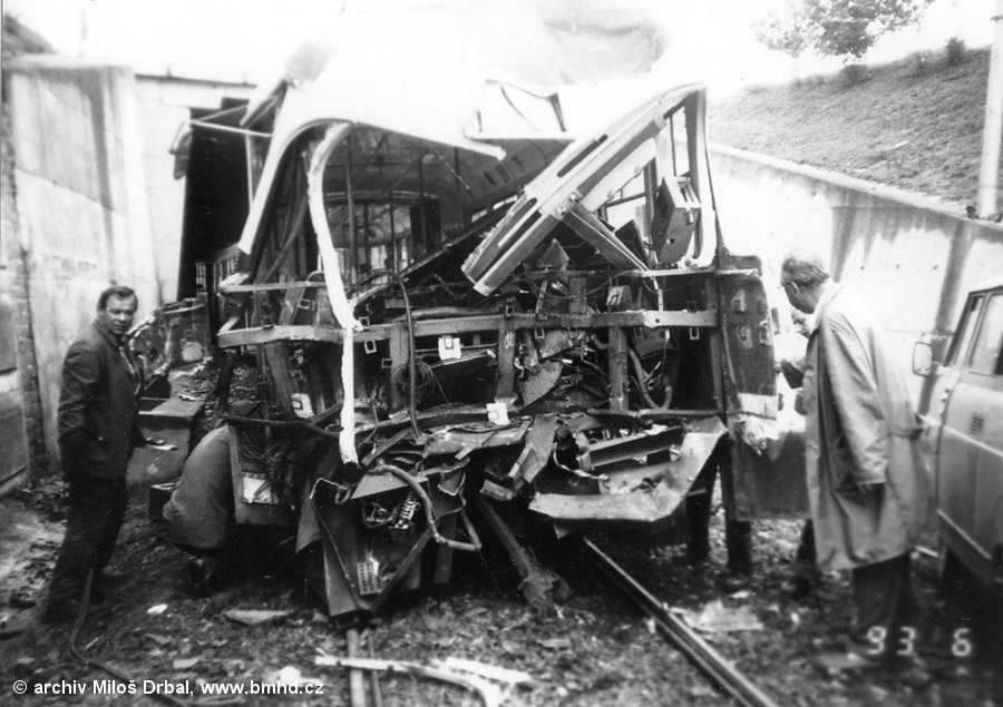 zdemolované čelo K2 1077 po najetí do soupravy T3 1657+1556